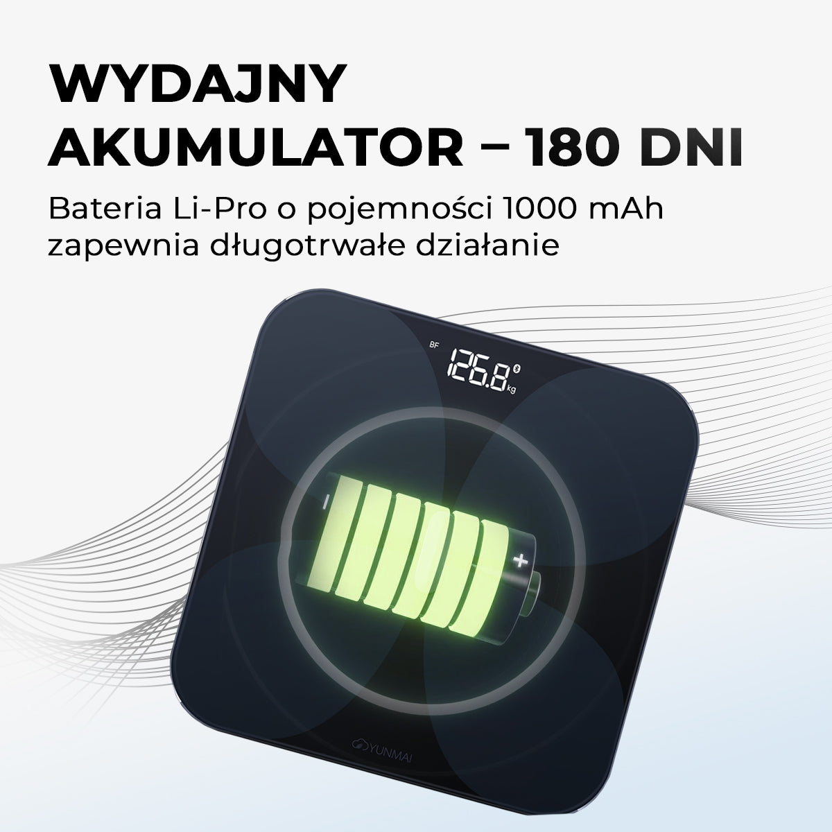 Wagi Yunmai Smart są zazwyczaj zasilane bateriami AAA lub akumulatorem litowo-jonowym, w zależności od modelu. Modele z akumulatorami mogą działać do 180 dni na jednym ładowaniu. Wagi z bateriami jednorazowymi mogą wymagać wymiany po kilku miesiącach regularnego użytkowania, w zależności od częstotliwości.