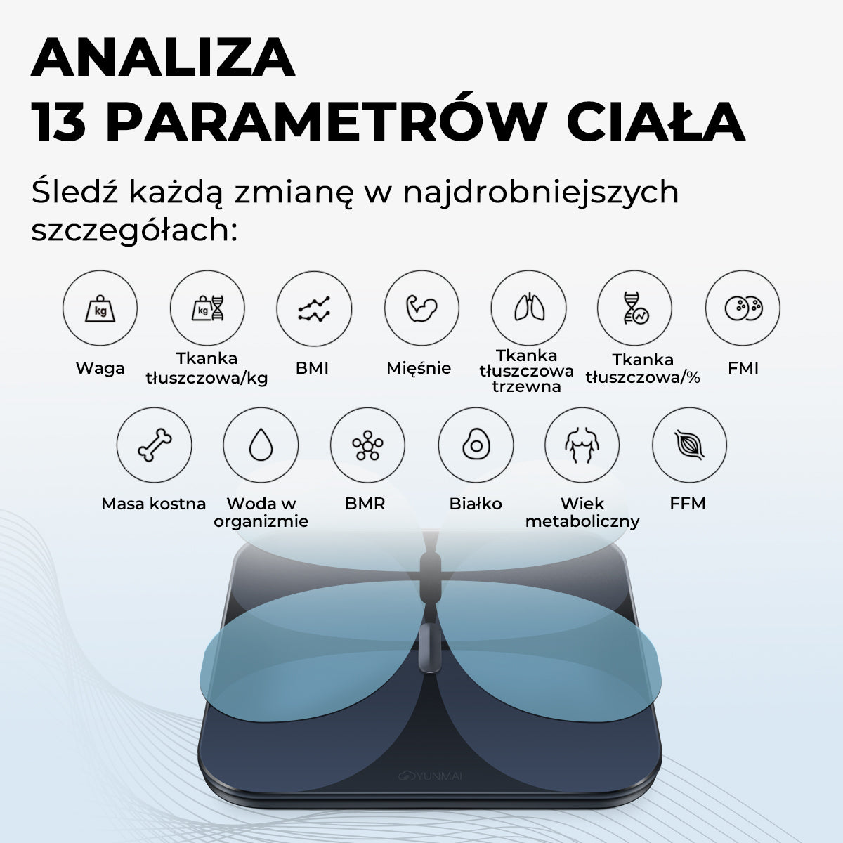 Inteligentne wagi Yunmai zazwyczaj mierzą 13 kluczowych parametrów ciała, w tym: