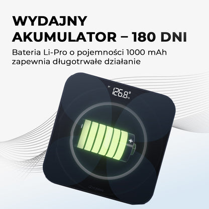Najnowsze wagi YUNMAI Pro są zasilane wbudowaną baterią Li-Po o pojemności 1000 mAh, specjalnie zaprojektowaną w celu optymalizacji zużycia energii. Jedno pełne naładowanie wystarcza na sześć miesięcy aktywnego użytkowania. Efektywność ładowania zapewnia starannie zaprojektowany system oszczędzania energii. Akumulator jest ładowany za pomocą międzynarodowo znormalizowanego portu Micro USB, a proces ten trwa zaledwie 3 godziny. Oznacza to, że możesz cieszyć się funkcjonalnością wagi przez długi czas, nie martwiąc się o ciągłe ładowanie.