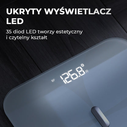 Elegancja w każdym elemencie sprawia, że ten model jest szczególnie atrakcyjny. Posiada 2,63-calowy ukryty wyświetlacz LED z 35 diodami LED do wyświetlania wyników pomiarów. Liczby są łatwo widoczne w jasnym świetle słonecznym i w nocy. Wystarczy dotknąć górnego panelu stopami, aby aktywować wskaźnik danych. W trybie czuwania ekran automatycznie się wyłącza, płynnie wtapiając się w główny kolor szklanej powierzchni.