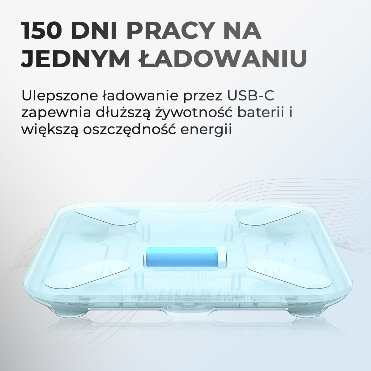 YUNMAI X Smart Scale jest łatwa w ładowaniu dzięki portowi typu C. Wystarczy podłączyć kabel ładujący, aby szybko i wygodnie naładować urządzenie. Zapewnia to płynną pracę i codzienny komfort. Dzięki tej funkcji waga jest zawsze gotowa do pracy, zapewniając dokładne pomiary i niezawodność do 90 dni.