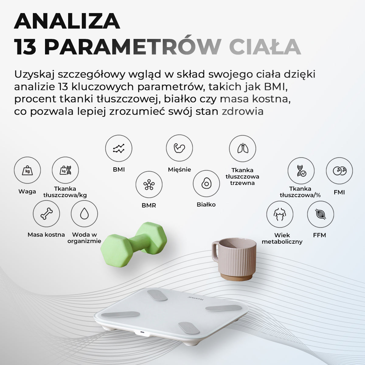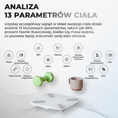 Inteligentne wagi Yunmai zazwyczaj mierzą 13 kluczowych parametrów ciała, w tym: