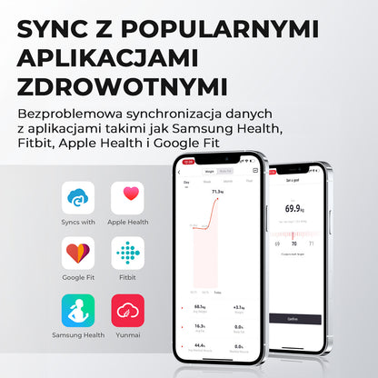 Aplikacja YUNMAI synchronizuje się z wagą i smartfonem, umożliwiając szczegółowe monitorowanie zdrowia. Ta aplikacja oferuje kompleksową analizę danych i monitorowanie w czasie rzeczywistym parametrów życiowych ciała. Integracja z innymi inteligentnymi urządzeniami zapewnia pełny przegląd Twojego samopoczucia fizycznego, wspierając Twoje wysiłki na rzecz utrzymania zdrowego stylu życia.